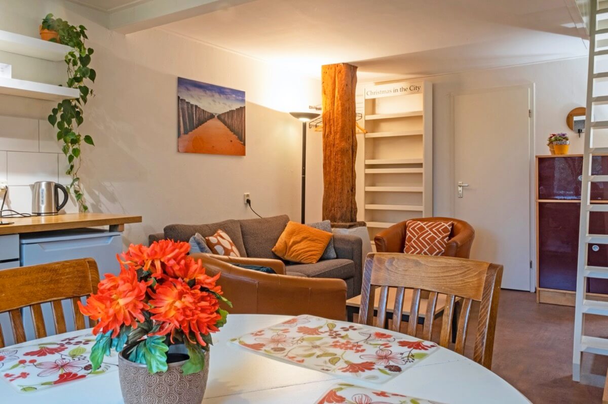 Im Erdgeschoss finden Sie eine Küche mit Kochnische, Kühlschrank, Mikrowelle und Essbereich sowie eine Sitzecke mit TV. Im Erdgeschoss gibt es eine Dusche und eine Toilette.